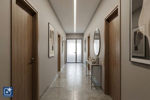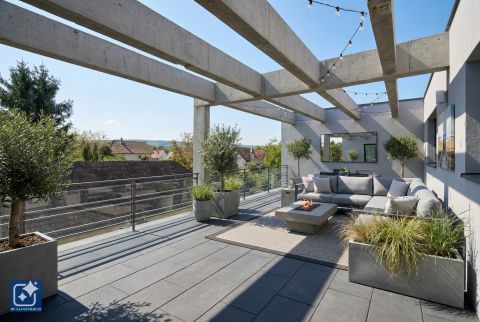 Külön lakások az emeleten: A felső szinten két teljesen különálló lakás található, amelyekhez egy hatalmas panorámás terasz tartozik ideális lakhatásra vagy bérbeadásra.