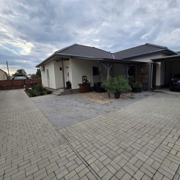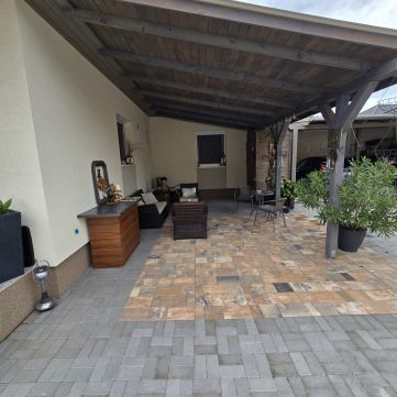 - Fedett terasz, térkő burkolással