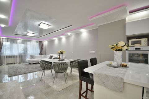 Az ingatlan magas minőségben felújított, igényes burkolatokkal és prémium bútorzattal berendezett, amelyek igény szerint megvásárolhatóak. A lakás központi tere egy tágas, 40 m²-es amerikai konyhás nappali, amely beépített gépekkel felszerelt, világos, modern hangulatú. Az álmennyezetbe épített hangulatvilágítás elegáns, exkluzív atmoszférát teremt.