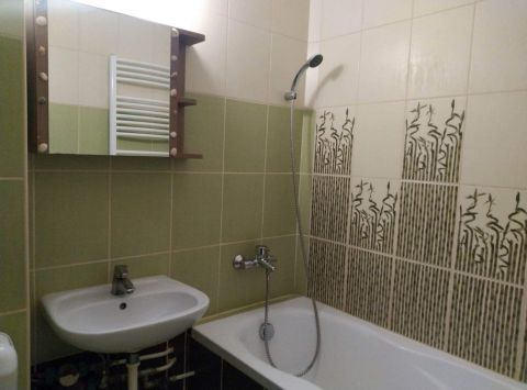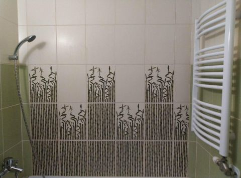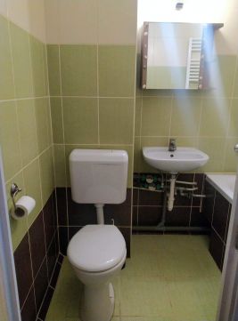 A fürdőszoba és wc egy térben található, hidegburkolattal ellátott, kádas.
