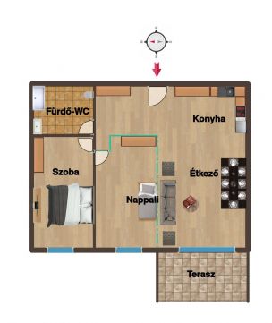 A lakás alapterülete 56 m2 ehhez tartozik egy 80 m2-es elkerített kert, amin egy 12 m2-es fedett terasz található.