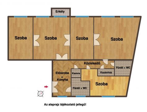 A nagy belmagasság és a parkettázott helyiségek klasszikus polgári hangulatot adnak az ingatlannak, amely igény szerint galériázható is. Négy szoba a körútra néz, így a lakás kifejezetten világos és reprezentatív. ÉNY-i tájolása kellemes fényviszonyokat biztosít.