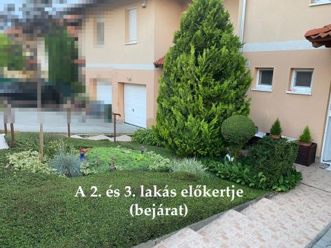 A lakáshoz tartozó garázson kívül egy autó számára kerítésen belüli beálló, egy további autónak pedig az elektromos kapu előtt biztosított a helye.