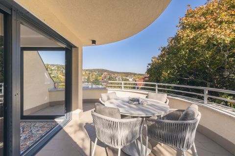 A lakás központi eleme a tágas nappali-étkezőkonyha hármas egysége, ahol a nagy üvegfelületek és a nappaliból és étkezőből nyíló teraszok valódi budai életérzést teremtenek.