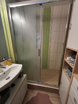 Fürdőszobájába dupla állású épített zuhany került kialakításra, wc-je pedig külön helyiségben került kialakításra.