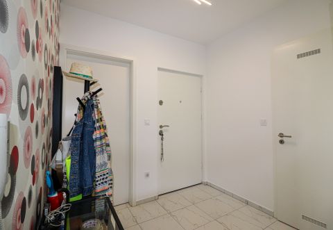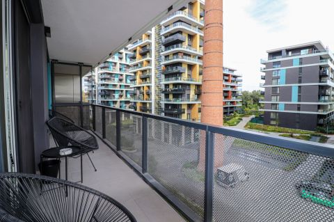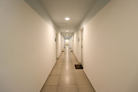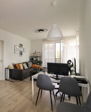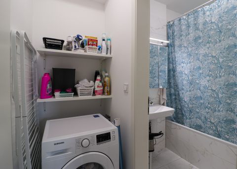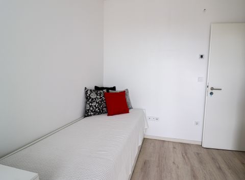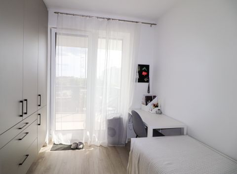 Az amerikai konyhás nappali 24,5 nm területű, közvetlen kijárattal a teraszra. A szobák külön nyílóak, mind a két szobához gardrób és terasz tartozik. A kényelmes fürdőszoba káddal kivitelezett, a mellékhelyiség valamint a mosógép kiállás külön helyiségben kapott helyet.