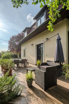 Kivételes kertkapcsolatos lakás eladó Budakalászon, az Omszki-tó szomszédságában.