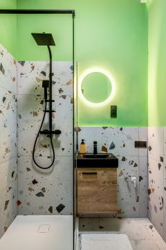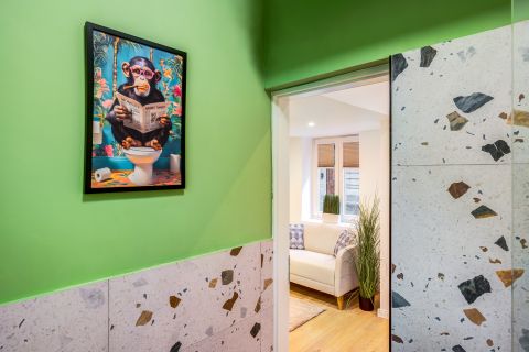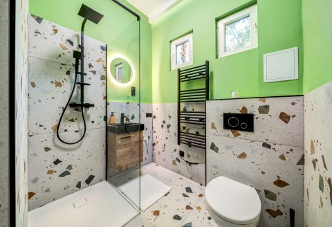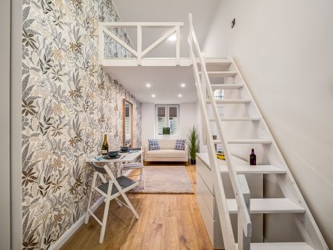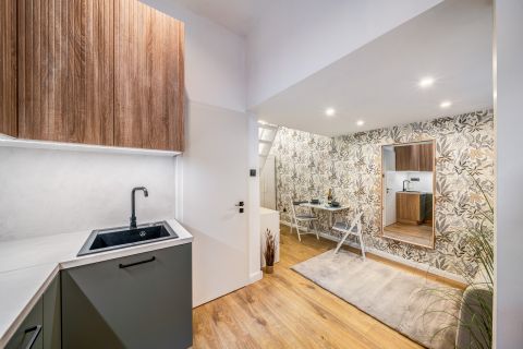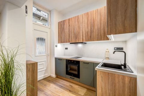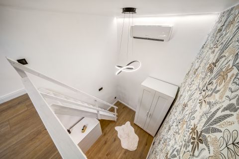 A lakás korábban egy 41 m2 ingatlan része volt, a professzionális leválasztást követően két különálló, modern lakás született, magas minőségű műszaki tartalommal és praktikus bútorokkal.