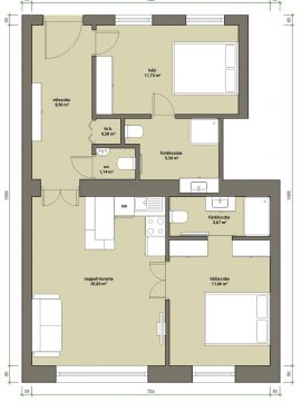 Az ingatlan funkcionálisan kiváló elrendezésű: nappali + 2 külön nyíló hálószoba, 2 fürdőszoba, külön vendég WC, valamint háztartási helyiség.