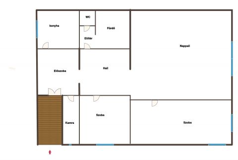Nappali, hall, két szoba, konyha, kamra, előtér, előszoba, fürdőszoba, külön wc.