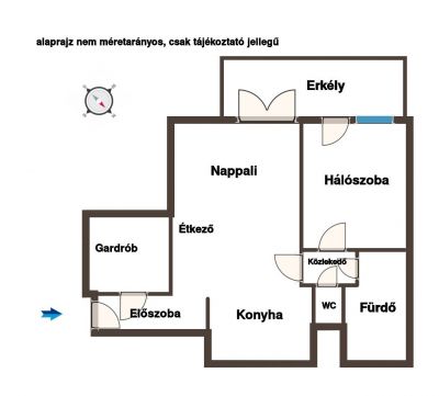 Elosztás: Tágas amerikai konyhás nappali, kényelmes hálószoba, külön mellékhelyiség, valamint rengeteg tárolókapacitás (gardrób és beépített szekrények).