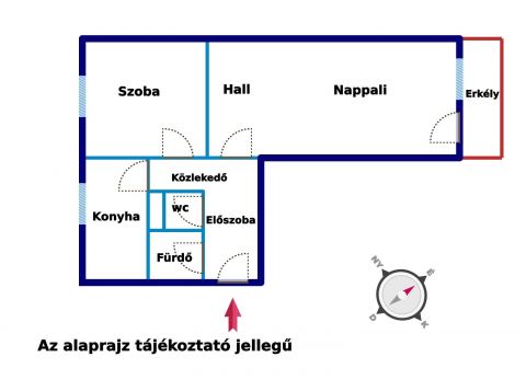 - előszoba, fürdőszoba, wc, közlekedő, nappali- hall, erkély, szoba, konyha