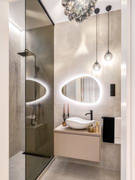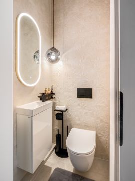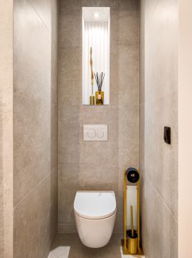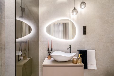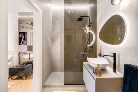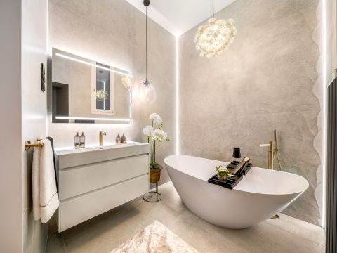 The decorative walls of the bedrooms were covered with slats and one of the most elegant wall panels of the year 2025, whose elegant surfaces give the space a special effect. Beds have been given individually designed upholstery headboards, behind which LED lighting makes the rooms as cozy as possible. The bathrooms have high-quality sanitary ware (Laufren, Villeroy&, Rokka, Deluzzo) and Italian design coverings (Marazzi) matching the style of the apartment. In the living room and bedrooms, electric awnings, blackout curtains, and cooling and heating air conditioners have been installed. Decorations by well-known designers (Kare, Art deco, Trusardi, IDdezing, Bo Concept, Einholtz, etc.) give the apartment a truly modern and elegant atmosphere.