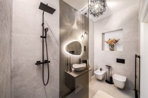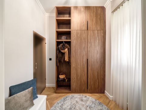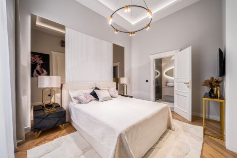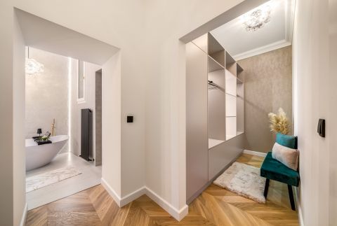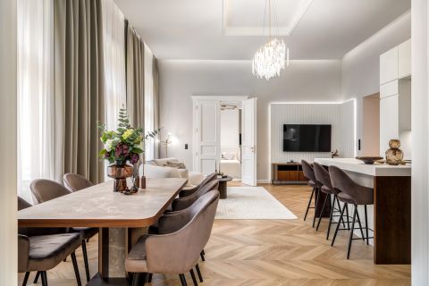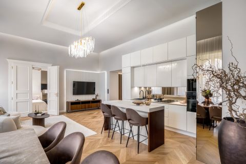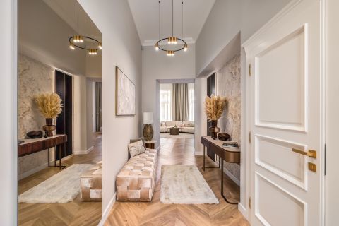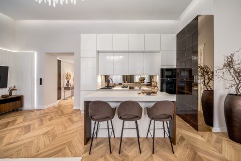 The interior designers put a lot of emphasis on the most practical arrangement, thus making the most of the floor plan features of the apartment. This is how 2 bedrooms with separate entrances, 2 wardrobe rooms, 2 bathrooms, 3 toilets, a spacious living room with an American-style kitchen island, a dining room and a hall with a spacious window were designed.