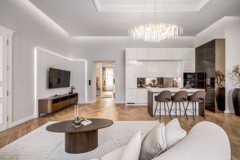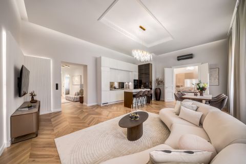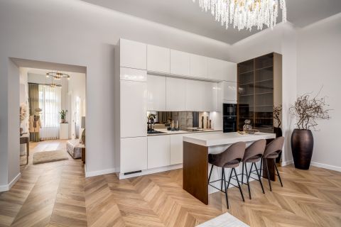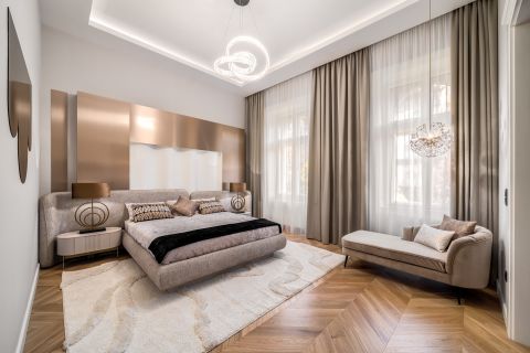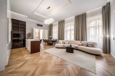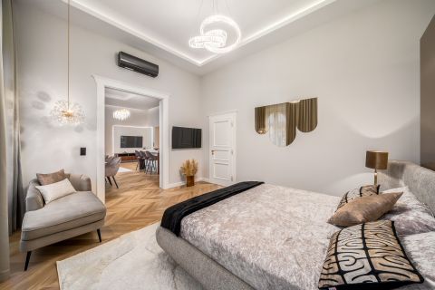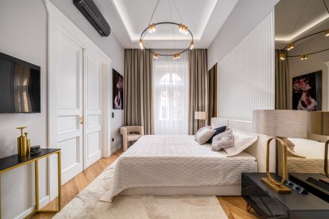 In the frequented part of the 5th district, this elegant luxury apartment of 130 m2, with a balcony, sunny, luxuriously renovated, facing the street, satisfying all needs, is for sale. It is located on the first floor of an orderly, well-maintained condominium.