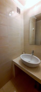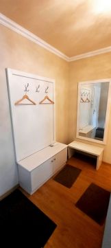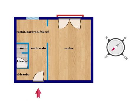 A kényelmes méretű szoba franciaerkélyes, dél-keleti fekvésű, nagyon szép napfényes! A lakásban található egy beépített szekrényes irattár / gardrob / étkező, egy előszoba-közlekedő és egy wc kézmosóval.