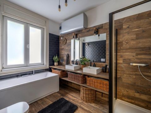 - ablakos, világos fürdőszoba káddal, zuhanyzóval, 2 mosdóval