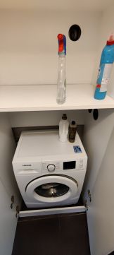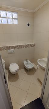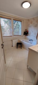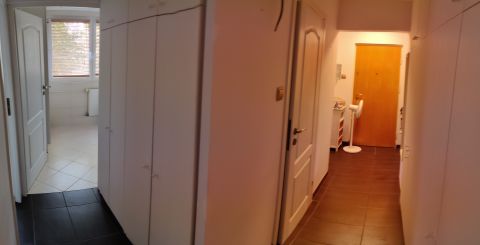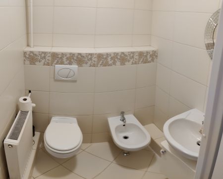fürdővel és bidés WC-vel. Hosszú beépített szekrény sor végig a folyosó