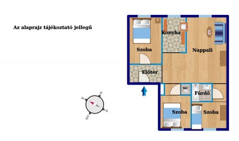 Felosztása: 1+3 szoba, konyha, fürdő, wc, előtér.