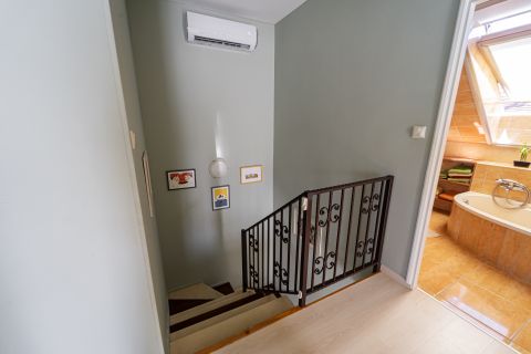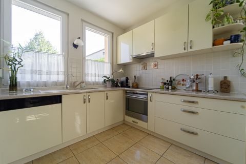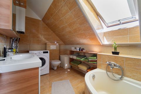 Földszint (50 m²): előszoba, vendég WC, világos nappali-étkező, gépesített konyha (új beépített gépekkel), közvetlen kijárattal a 18 m²-es teraszra és a kb. 130 m²-es intim kertbe