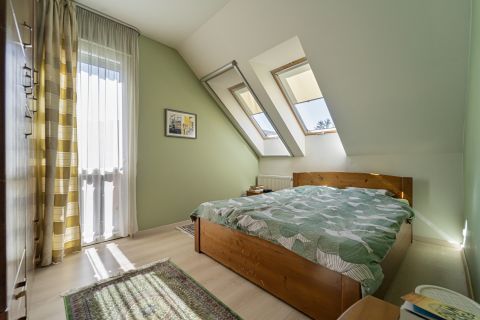 Emelet (nettó 40 m²): közlekedő, három hálószoba, fürdőszoba; az egyik hálóhoz erkély (3,6 m²) tartozik