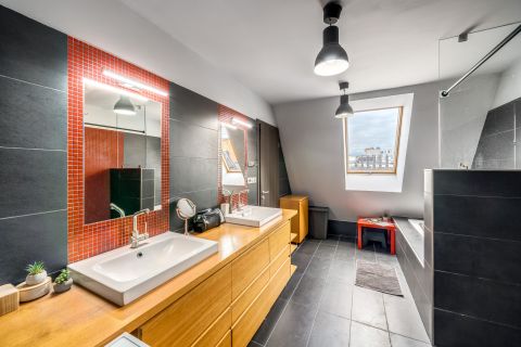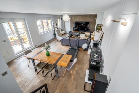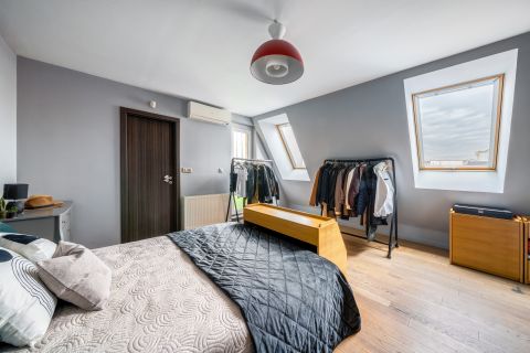 The top floor hosts a spacious private master bedroom with an impressive en-suite bathroom and access to a 21 m² rooftop terrace, offering complete privacy, panoramic views, and a perfect spot to relax on a comfortable sofa under the city lights.