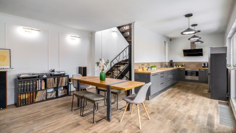 A striking designer staircase leads up to the main living area, where a bright, open-plan space with a real wood-burning fireplace and a fully equipped modern kitchen creates a warm, inviting atmosphere.