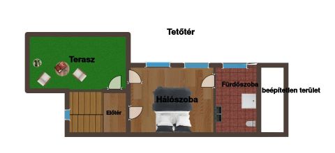 A tetőtéri szinten egy tágas, privát hálószoba kapott helyet, saját impozáns fürdőszobával és egy 21 m²-es, teljesen privát tetőterasszal, ahol kényelmes kanapén pihenhet, a város fényei és a budai hegyek látványa mellett.