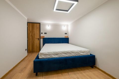 Az alsó szinten amerikai konyhás nappali került kialakításra, valamint egy WC-s fürdőszoba. A felső részen két külön hálószoba kapott helyet, ami ritka és rendkívül jól kihasználható megoldás ebben a méretkategóriában.