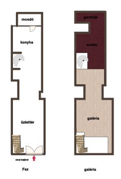 alsó szinten: világos üzlettér, konyha, külön mosdó és zuhanyzó