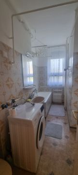A fürdőszoba jól szellőztethető, ablakkal ellátott, új mosógép található benne.