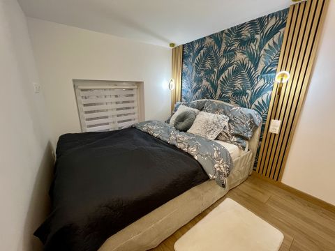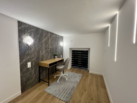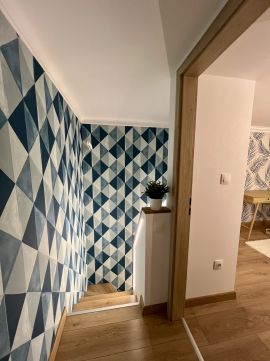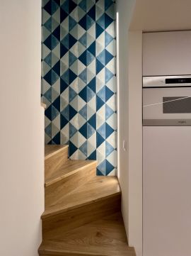 A konyha gépesített, felszereltsége magában foglalja a mosogatógépet, hűtőt és egy mikrohullámú sütőt, amely sütőként is funkcionál. A lépcső alatt praktikus módon lett elhelyezve a bojler és a mosógép. A nappali teljes berendezése a lakással együtt eladó, a felső szinten pedig két hálószoba található: az egyik franciaággyal, a másik pedig íróasztallal berendezve.