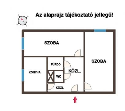 A lakás elrendezése praktikus és jól átgondolt: két kényelmes szoba, közlekedők, konyha, fürdőszoba és egy különálló WC található benne. A közös tárolóhelyiség az emeleten, amelyet négy lakó oszt meg, további tárolási lehetőséget biztosít, ami különösen hasznos lehet a kisebb alapterületű lakások esetében.