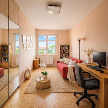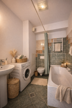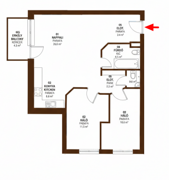 A nappaliból egy 6 m²-es erkély nyílik, amely ideális pihenésre. A különleges hangulatú, üvegtéglával áttört falú, kádas fürdőszoba természetes fényt kap, emellett külön WC kis mosdóval biztosítja a mindennapi kényelmet. A lakás klimatizált, az egyik hálószobában egyedileg tervezett, nagyméretű beépített szekrény található, amely a konyhabútorral együtt a vételár részét képezi.