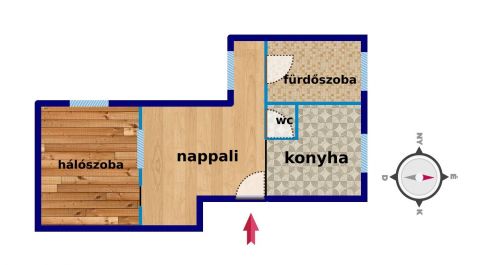 Helyiségei: előszoba, nappali és ebből leválasztott hálófülke, konyha, fürdőszoba és külön wc.