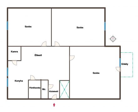 - nappali+ 2 szoba, étkező-konyha, fürdőszoba, külön wc, kamra, előszoba és erkély helyiségekből áll