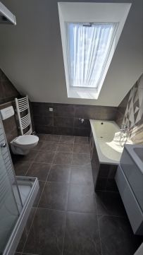 A fürdőben kád és zuhanyzó is helyet kapott.