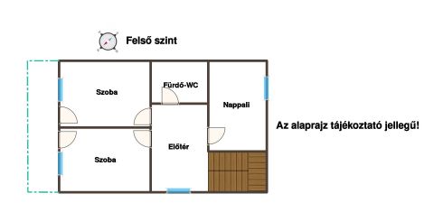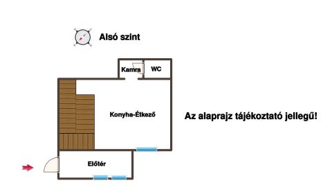 A földszinten előszoba, konyha-étkező, kamra, WC került kialakításra.