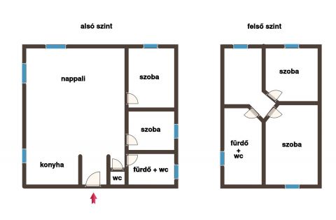 felső szint: 2 hálószoba, fürdő wc-vel