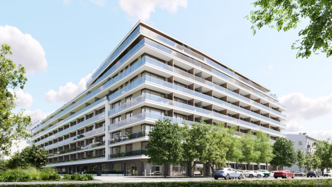 XIII. kerületben, Vizafogón, a Duna-part közelében, prémium kategóriás lakóparkban eladó egy 54 m²-es + 5 m² erkélyes, kétszobás, nyugati tájolású, I. emeleti új építésű lakás.