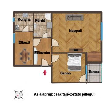 Tökéletes elosztás: A 1,5 szoba külön bejáratú, így biztosított a zavartalan pihenés. A konyha tágas, külön étkezővel rendelkezik, ami ritka és praktikus megoldás ekkora alapterületen.
