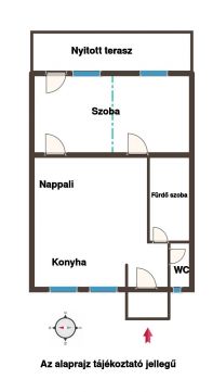 A lakás helységei: előtér, amerikai konyha nappali, egy szoba (kialakításának köszönhetően és az eredeti terv alapján könnyedén két szobára osztható), valamint fürdő szoba, külön helyiségben pedig a WC.