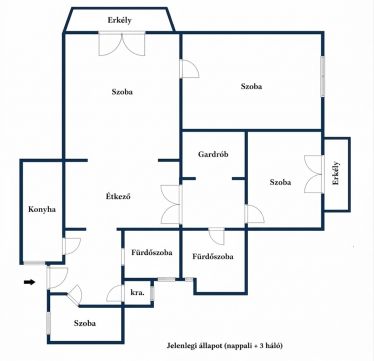 Az alaprajz további átalakítási lehetőségeket is kínál: az ablakos konyhából akár egy plusz szoba is kialakítható, míg a konyha kényelmesen áthelyezhető a jelenlegi étkező helyére.