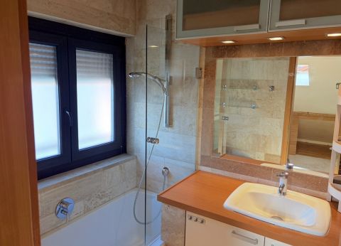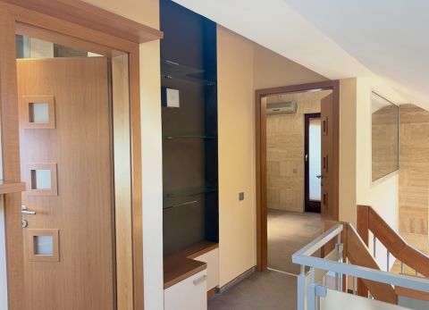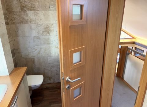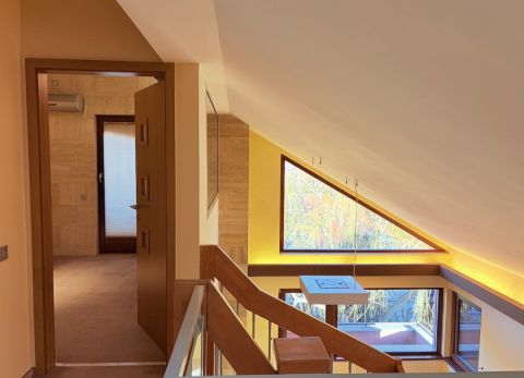 Az ingatlan belső kialakítása igényes anyaghasználattal készült: a legtöbb helyiségben travertin mészkő burkolat található a padlón és a falakon is.