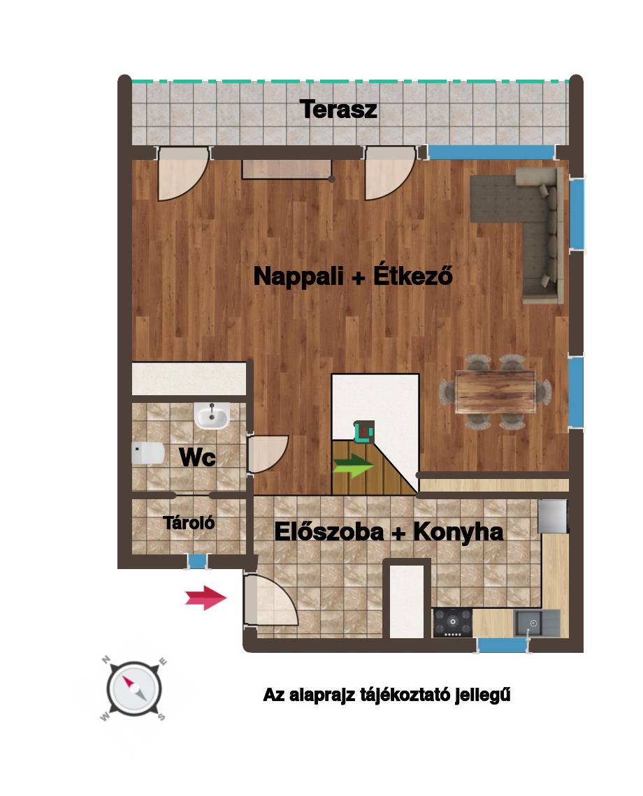 nappali, konyha és előtér egy légtérben