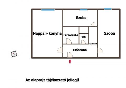 - előszoba, nappali-konyha, 2 hálószoba, közlekedő, fürdő, wc