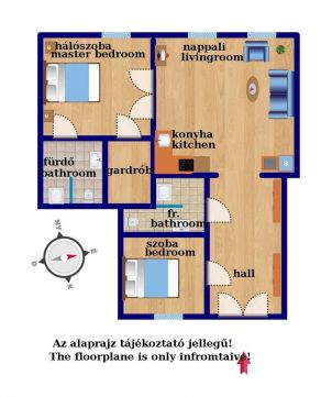 Elrendezése szerint: amerikai konyhás nappali, 2 külön nyíló hálószoba, melyből egyik udvari, másik csendes utcai nézetű, külön gardrób helyiséggel. 2 fürdőszobás, duplakomfortos. Bosch kondenzációs kazánnal és klímával felszerelt.