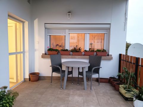 Az ingatlanhoz tartozik egy 12 m²-es, részben fedett terasz, amely kellemes helyszínt biztosít a pihenéshez vagy a reggeli kávé elfogyasztásához a zöld környezetben.