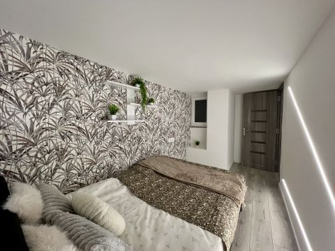 A felső szinten két hálószoba kapott helyet, míg a földszinten egy teljes értékű szoba, amerikai konyhás nappali, zuhanyzós fürdőszoba és külön vendég-WC található.