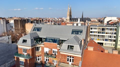 Eladásra kínálunk Budapest egyik legkarakteresebb, belső kétszintes, tetőteraszos ingatlanát. Ez a 2011-ben, ráépítéssel létrehozott loft-penthouse egy 1932-es építésű, art deco stílusú, liftes társasház legfelső szintjeit foglalja el. A lakás nettó lakóterülete 203 m², a teraszokkal együtt azonban 240 m²-es élettérrel rendelkezik.